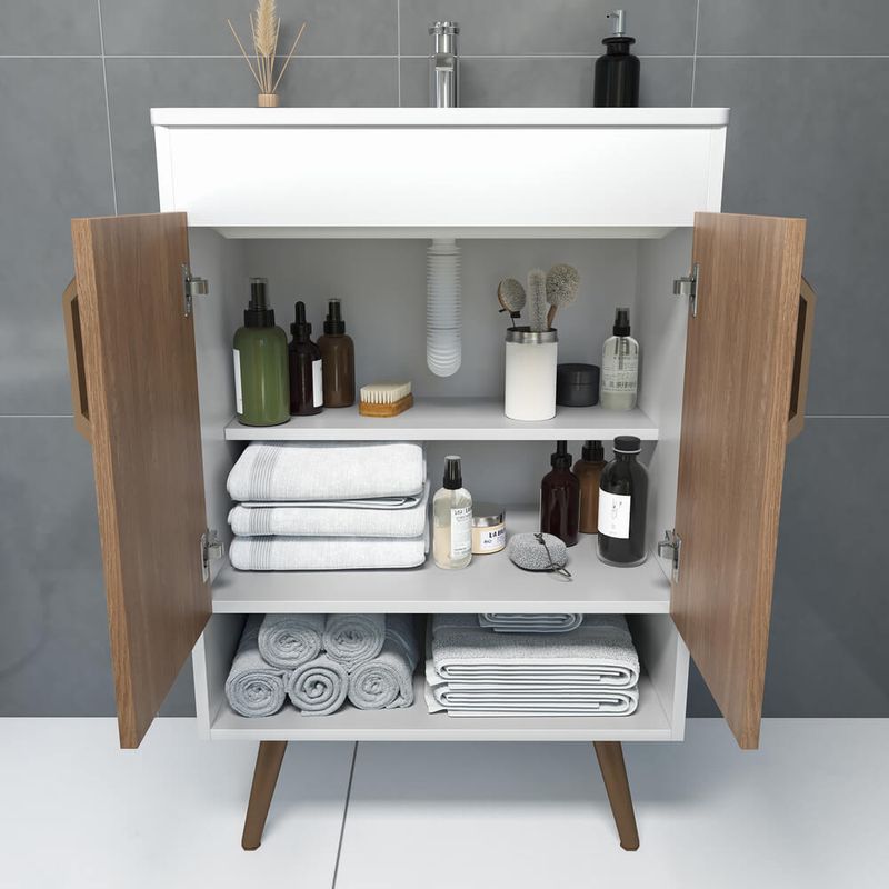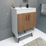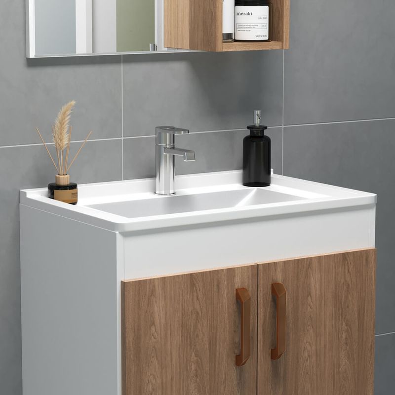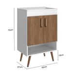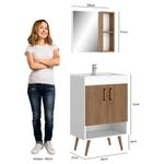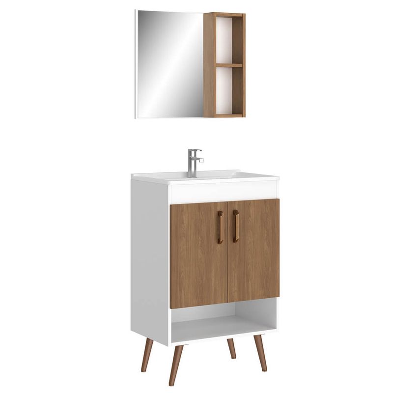 O conjunto para banheiro Verona Branco/Carvalho com Pés além de prático e funcional traz todo o requinte, beleza e sensibilidade em um único produto. Móvel confeccionado em MDP de 15mm com costa em 2,5mm. Balcão de 60 x 37 x 88cm, 02 portas com dobradiças em aço e 01 nicho, também companha 02 puxadores em polímero ABS e kit para instalação. Lavatório produzido em mármore sintético de 60 x 38 x 9cm com furações de 35mm para colocação de ralo e torneira (acessórios não acompanham produto). Espelho de 3mm com painel branco com 02 nichos em carvalho em MDP de 15mm medindo 54 x 51 x 11,5cm acompanha suportes para instalação. Produtos já enviados montados, basta fazer a instalação hidráulica.