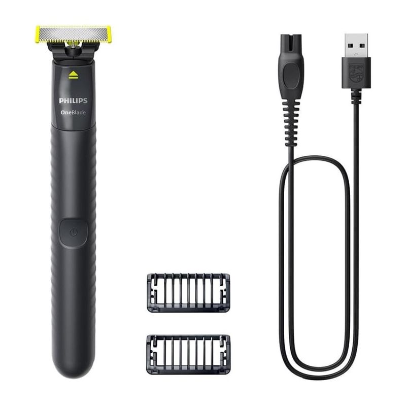 Conteúdo da embalagem: 1 Aparador de pelos Philips OneBlade + 2 pentes para barba + tampa de proteção + cabo de carregamento