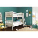 Beliche com 100% madeira maciça, sendo: cabeceiras, barras(travessas) e escada da cama são fabricados com madeira pinus reflorestável, os 11 lastros em madeira eucalipto reflorestável, a pintura UV na cor Branco lavado aparecem os veios da madeira. O kit de ferragem está composto de parafusos, sarafos de pinus, chave alien e manual de montagem. A espessura das barras ou travessas são 2,3cm em madeira maciça em pinus, os pés da cama são de espessura de 6,3cm em pinus. Escada fixada com gancho para a fácil remoção. Embalagem do produto cabeceira e barras em caixa de papelão.