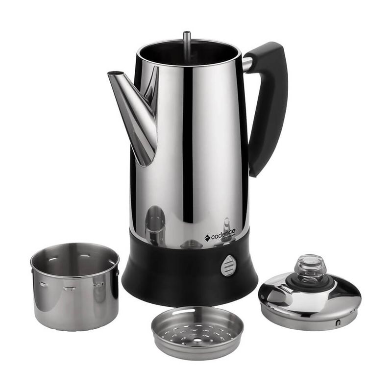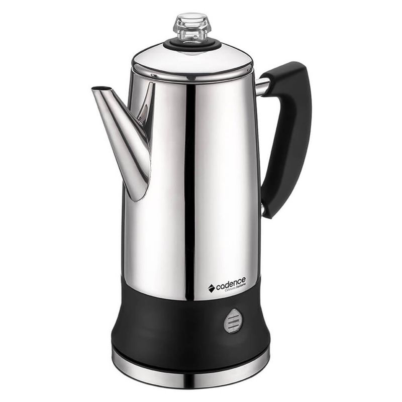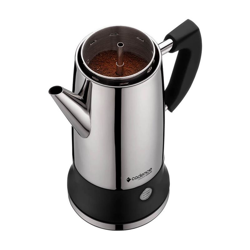 Com design em aço inoxidável, a Cafeteira Italiana Elétrica Inox tipo Moka filtra por percolação, mantendo a temperatura sem queimar o café e extraindo o sabor por inteiro.