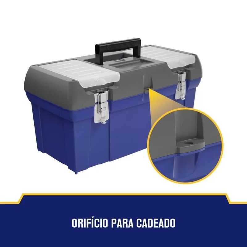 Construída com materiais robustos para resistir a condições adversas. Trava metálica resistente para manter suas ferramentas seguras durante o transporte. Design espaçoso com compartimentos ajustáveis para organização personalizada.