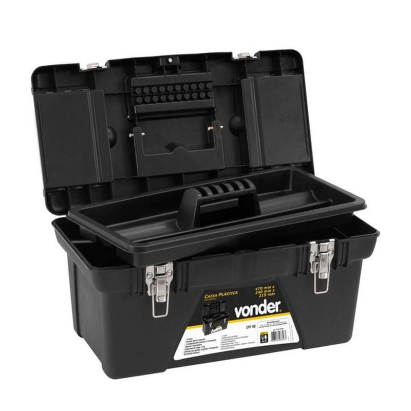 . Possui duas travas, três compartimentos externos (dois removíveis) e bandeja para ferramentas removível