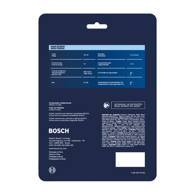 O carregador de bateria Bosch 18V GAL 18V-20 é BIVOLT, possui luz LED que indica a carga completa da bateria e é compatível com 100% das ferramentas 18V Bosch. O carregador de bateria Bosch 18V GAL 18V-20 possui tempo de carregamento de 50/65 minutos para baterias de 2 Ah e 96/125 minutos para baterias de 4 Ah. Para melhor desempenho, utilize acessórios e ferramentas Bosch .Garantia 2 anos Bosch.