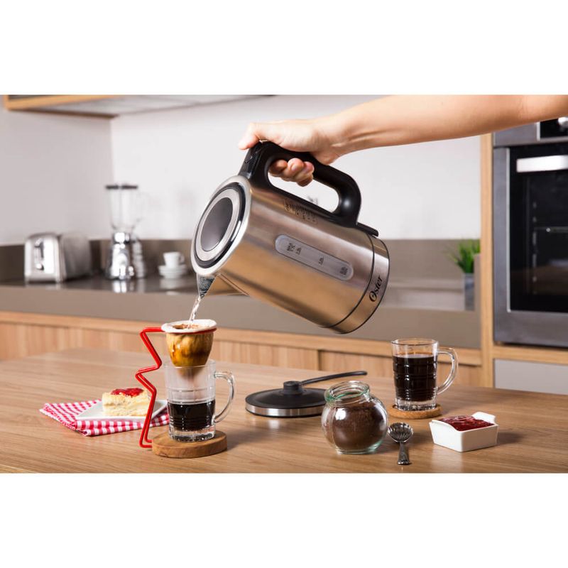 A Chaleira Elétrica Digital Oster é supersegura e eficiente. Conta com desligamento automático e capacidade para até 1,7L de água, ideal para auxiliar no preparo de alimentos.