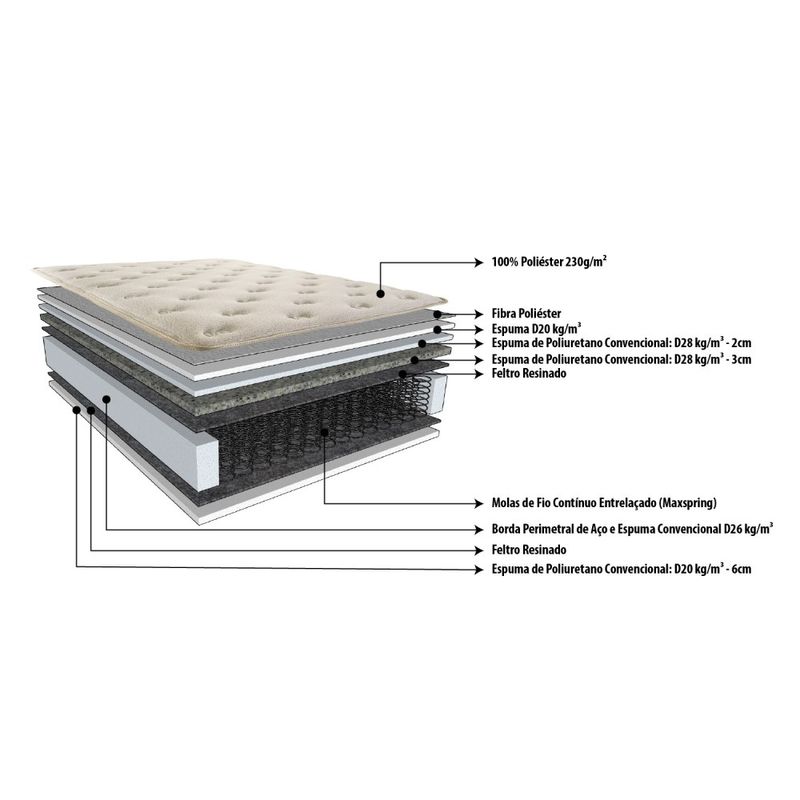 Revestimento do tampo em tecido Malha de alta qualidade, e proporciona um toque extremamente macio e produz uma sensação ainda maior de conforto e liberdade de movimentos durante o sono. No bordado do tampo possui espuma e uma manta de poliéster para agregar um toque maior de maciez ao produto.