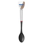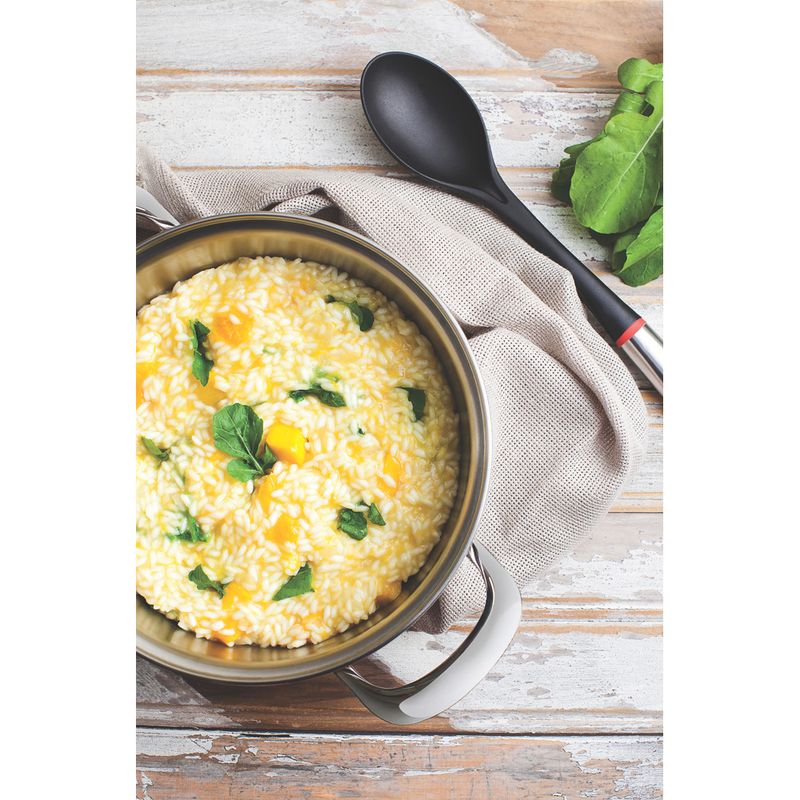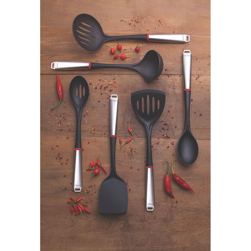 Quem é apaixonado por gastronomia adora trazer detalhes para a sua cozinha que demonstram o seu amor. Pensando nisso a Tramontina lançou a linha Moderne, que traz utensílios confeccionados em nylon com cabo de aço inox e um detalhe charmoso em vermelho. Para completar o seu kit de utensílios não pode faltar a colher para arroz aço inox/nylon da Tramontina. Resistente ao calor, ela suporta temperaturas de até 180°, contando com a durabilidade e a qualidade dos produtos Tramontina. Para utilizá-la na decoração da sua cozinha é muito simples, seu cabo com furo permite criar uma organização bonita dos itens na parede.