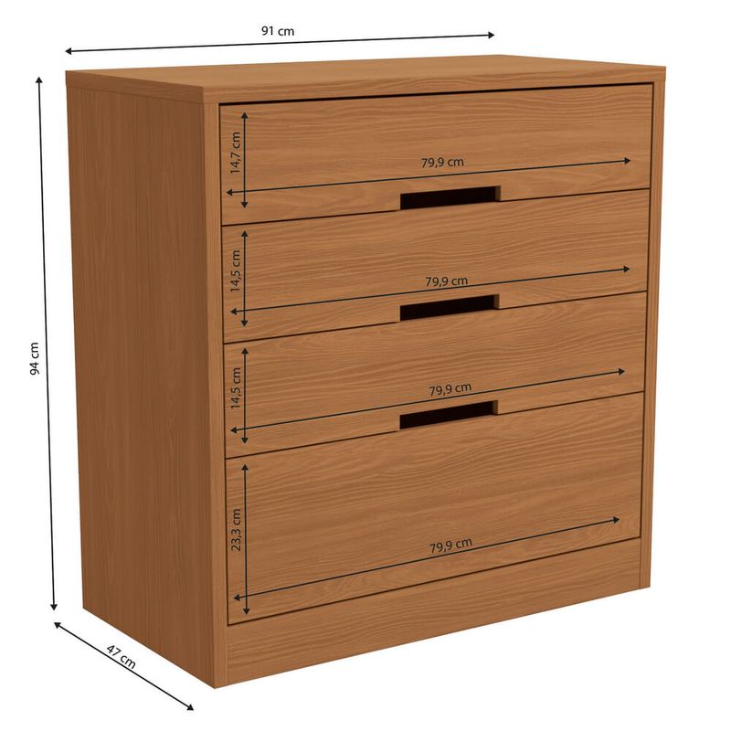 Com dimensões de: 94 x 91 x 47 cm, esta cômoda otimiza seu espaço, proporcionando uma organização inteligente. Suas 3 Gavetas e 1 Gavetão, com corrediças Metálicas, garantem um deslize suave e durabilidade, contribuindo para a praticidade no uso diário.