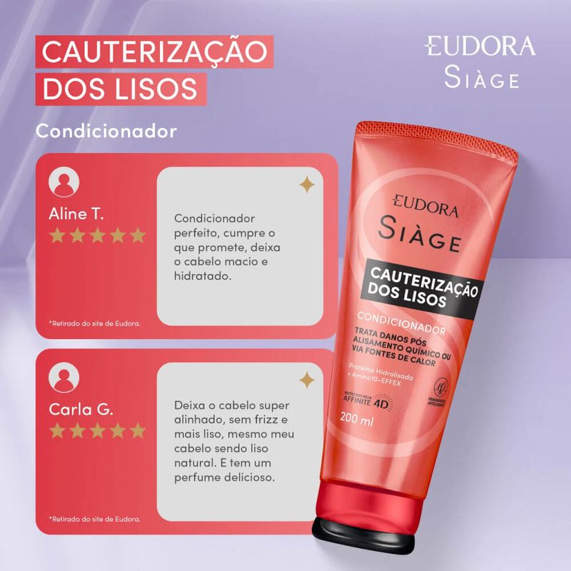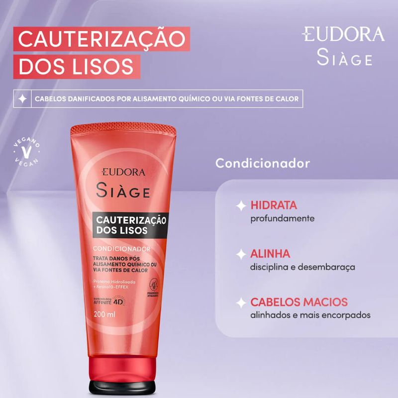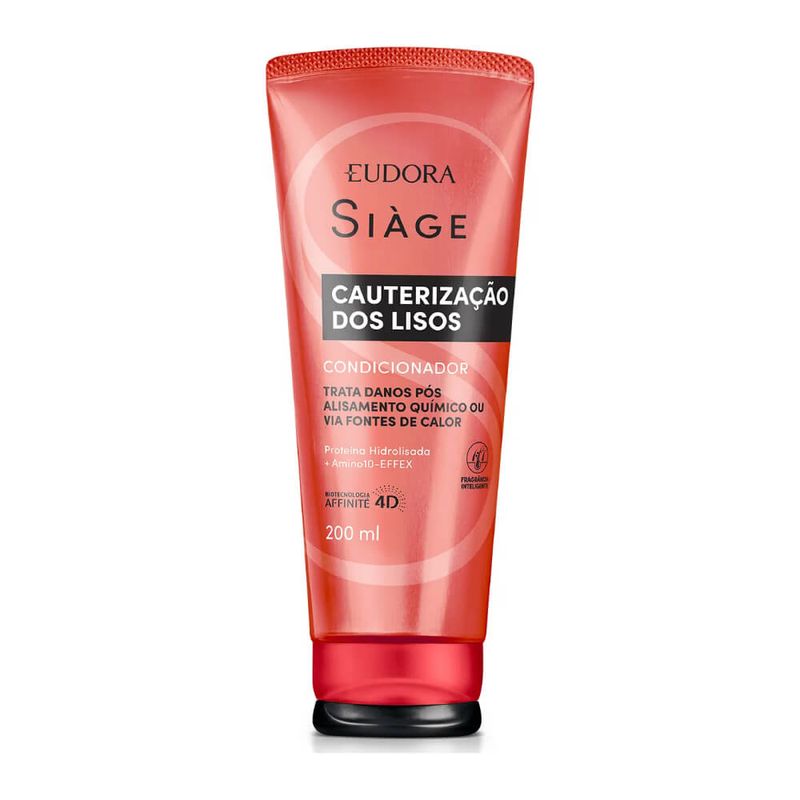 O Condicionador Siàge Cauterização dos Lisos alinha, disciplina e desembaraça os fios, desde a primeira aplicação. Ideal para cabelos lisos ou alisados por processo químicos , conta com alta resistência e explosão de fragrância , que resiste ao calor do secador e da chapinha, mantendo a perfumação da linha nos fios. Sua fórmula é rica em Amino10-effex, um blend exclusivo com 10 tipos diferentes de aminoácidos que fortalecem as fibras capilares e atuam no combate o afinamento das pontas . Além disso, contém Proteína Hidrolisada, que repõe os nutrientes dos fios, garantindo eficiência no tratamento e proteção contra as agressões externas , além de tratar os danos pós-alisamento químico ou via fontes de calor , sem deixar a hidratação de lado. O uso da linha completa entrega benefícios para antes e depois do processo de alisamento : Resultados pré-química: Recarrega os nutrientes dos fios deixando-os mais fortes; Auxilia na proteção do cabelo pré alisamento. Resultados pós-química: Preenche a fibra capilar e garante fios blindados e resistentes para o seu próximo alisamento;Repõe as proteínas essenciais do fio. Siáge Cauterização dos Lisos é resultado de salão em casa! Nenhum produto Eudora é testado em animais, ou seja, este item possui selo Cruelty Free.