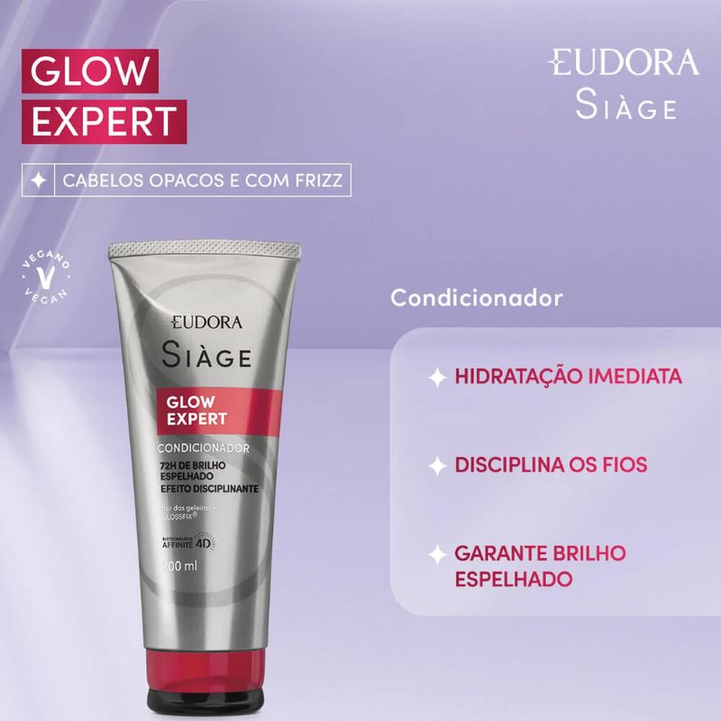 O Condicionador Siàge Glow Expert garante selagem das cutículas e muito brilho com alta capacidade de refletir a luz. Ideal para cabelos opacos que sofrem com fios indisciplinados e frizz , esse item entrega um verdadeiro resultado de salão para suas madeixas. Eudora Siàge buscou nos alpes suíços um ativo raro e inovador, para inspirar e trazer brilho revolucionário. Sua fórmula contém Flor de Geleiras que recria o banho gelado nos fios para um brilho espelhado, e Glossfix , componentes que fixam o brilho no cabelo e aumentam a durabilidade do tratamento. Inovador, a linha entrega cabelos 90% mais disciplinados, 72 horas de brilho espelhado e devolução de 100% do brilho dos fios, além de benefícios como: -Fios polidos e brilhantes; -Selagem das cutículas e efeito disciplinante; -Redução do frizz; -Brilho espelhado. O resultado? cabelos hidratados, macios, disciplinados e brilhantes diariamente. SOBRE A LINHA Siàge Glow Expert buscou nos alpes suíços um ativo raro e inovador e adicionou um blend de ingredientes para chegar em uma fórmula única e exclusiva, que entrega brilho revolucionário por 72 horas , fios polidos e disciplinados , sem deixar os cabelos com aspecto oleoso ou pesado. Nenhum produto Eudora é testado em animais, ou seja, este item possui selo Cruelty Free.