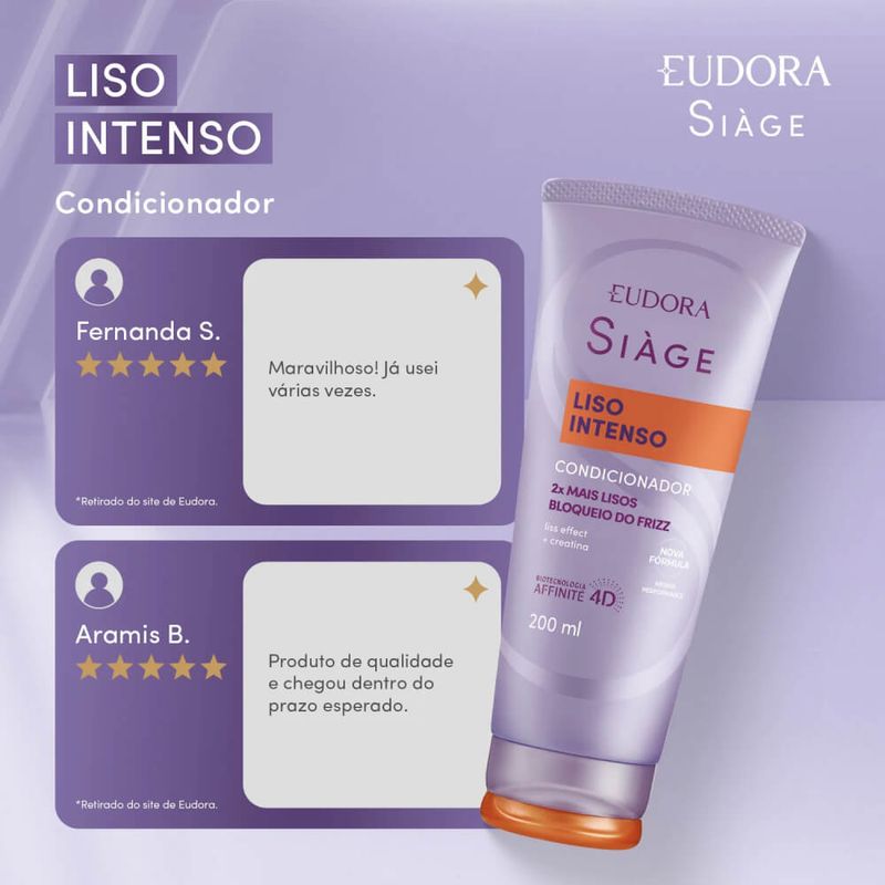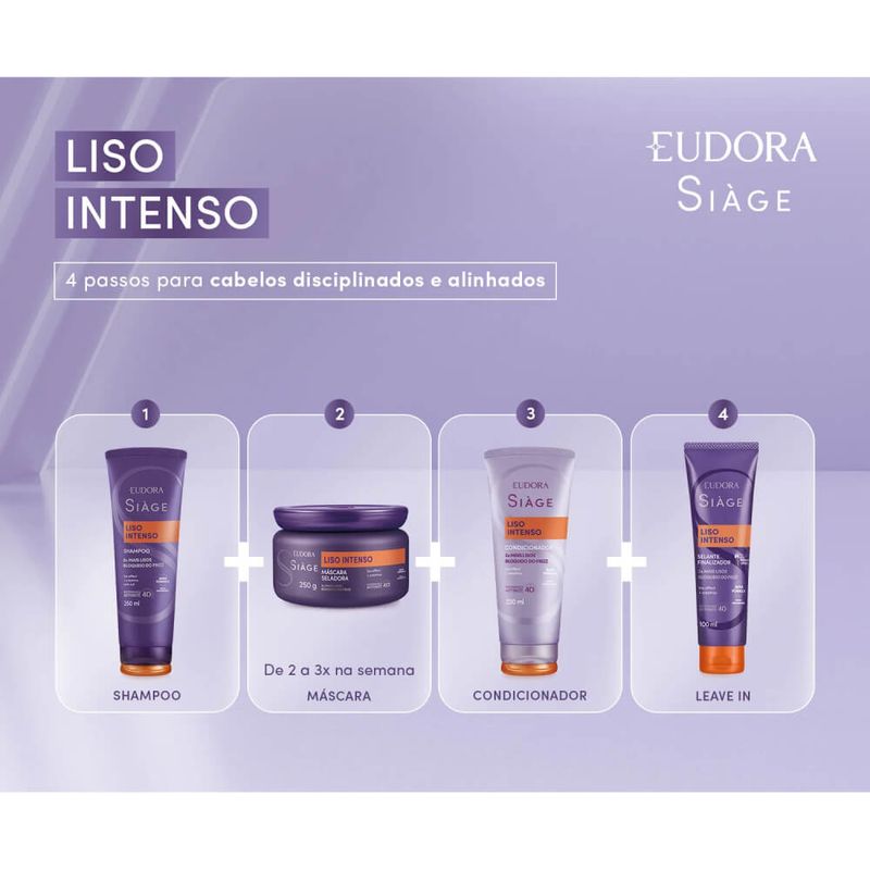 Eudora Siàge Liso Intenso possui fórmula inteligente que se adequa a lisos naturais, alisados ou com ondas indesejadas, proporcionando liso extremo por muito mais tempo. Seus produtos entregam hidratação, cuidados diários, cabelos 2x mais lisos e bloqueio do frizz.