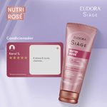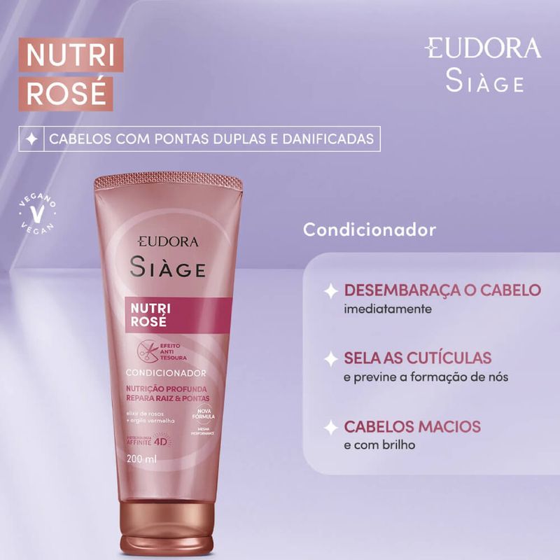 O Condicionador Siàge Nutri Rosé possui fórmula altamente hidratante para garantir cabelos macios e com brilho. Sua fórmula com Elixir de Rosas , entrega um ativo poderoso obtido através da colheita de 30 mil pétalas de rosas que garantem a reparação dos fios por inteiro. Com o incrível Efeito Anti-tesoura não será mais necessário recorrer ao corte para ter cabelos lindos e saudáveis. Além de devolver sua resistência natural, evitando que eles se quebrem facilmente. O condicionador proporciona cabelos com toque macio, mais resistentes, com brilho natural e benefícios como: -Nutrição profunda até a 3ª camada do fio; -Reparação instantânea e duradoura, sem pesar; -Raiz saudável e comprimento livre de pontas duplas. O Condicionador Siàge Nutri Rosé desembaraça o cabelo imediatamente, sela as cutículas e previne a formação de nós. SOBRE A LINHA A linha Siàge Nutri Rosé é enriquecida com um poderoso Elixir de Rosas , rico em vitaminas e antioxidantes que nutrem os fios e tem alto poder de reparação, combinado a natural Argila Vermelha que nutre os fios, promovendo equilíbrio ao couro cabeludo e reparação profunda da raíz às pontas. Nenhum produto Eudora é testado em animais, ou seja, este item possui selo Cruelty Free.