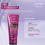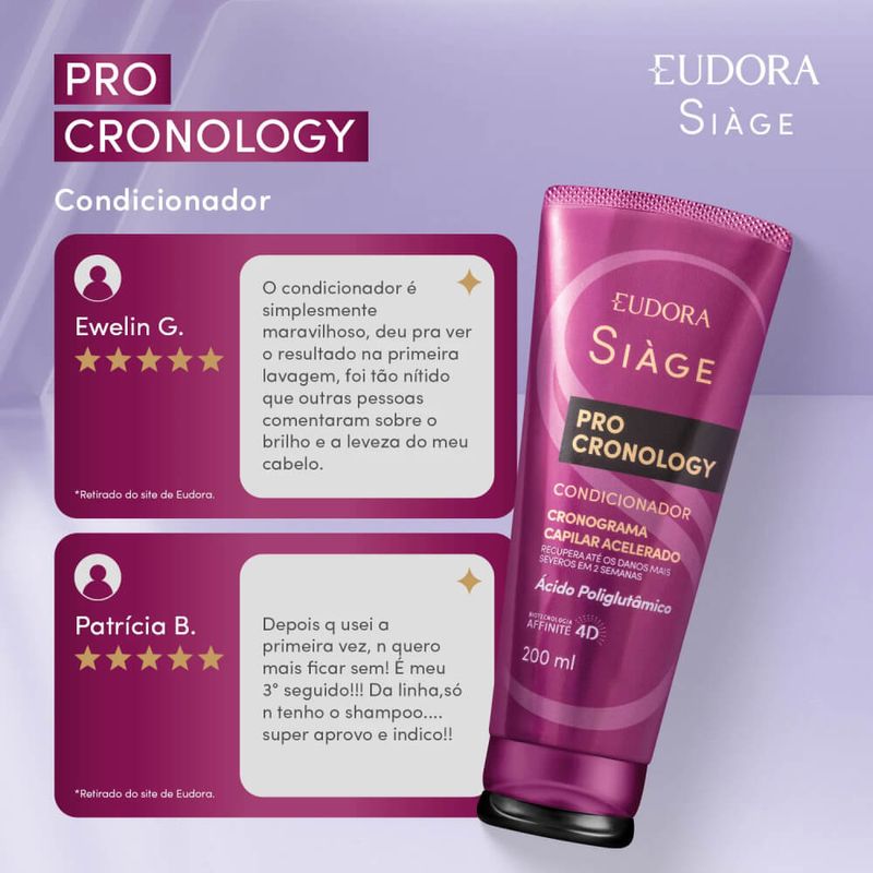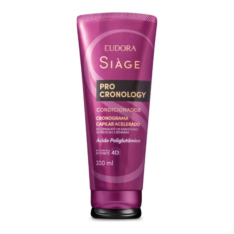 Siàge Pro Cronology traz o cronograma capilar acelerado capaz de recuperar todos os tipos de danos em 2 semanas . A linha pausa a degradação e o desgaste do fio e recupera os danos mais severos em todos os tipos de cabelo. Toda a linha possui fórmulas enriquecidas com Ácido Poliglutâmico: ativo biotecnológico que auxilia no equilíbrio da umidade natural interna e externa dos fios, garantindo maciez, brilho e alta hidratação dos cabelos. O Condicionador Siàge Pro Cronology possui ação ultra condicionante que sela as cutículas e garante que o tratamento seja mantido no fio, deixando-os mais fortes e maleáveis. Confira todos os benefícios deste condicionador: -Fios macios e desembaraçados; -Proporciona brilho; -Alta hidratação; -Fios mais fortes e maleáveis. Para garantir uma ação tão eficiente, a linha Siàge Pro Cronology age nas 3 etapas do cronograma proporcionando hidratação, nutrição com reposição de nutrientes essenciais e uma reconstrução poderosa que repara os danos. Além de ser vegano, este condicionador também possui fórmula sem parabenos, petrolatos ou corantes. Siàge Pro Cronology: cronograma capilar acelerado de 2 semanas que cabe na sua rotina! SOBRE SIÀGE Eudora Siàge uniu a força da natureza ao poder da ciência e criou a exclusiva biotecnologia Affinité 4D . Com inteligência detectora de danos, trata os fios até a camada mais profunda, mesmo após o enxágue. Siàge. Tecnologia para o seu melhor cabelo, todos os dias. Nenhum produto Eudora é testado em animais, ou seja, este item possui selo Cruelty Free.