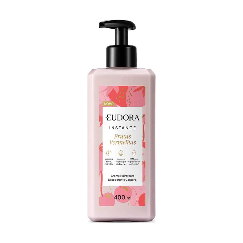 O Creme Hidratante Desodorante Corporal Instance Frutas Vermelhas traz uma fragrância suave e deliciosa! Idealizada para quem ama uma rotina de autocuidado diária e gosta de produtos de qualidade, a Linha Instance Eudora alia cuidados diários a fragrâncias inesquecíveis. Este produto é vegano e combina Manteiga de Karité , 97% de ingredientes naturais e glicerina vegetal , junção pensada para proporcionar hidratação profunda com pele macia e desodorizada. A combinação do dulçor das frutas vermelhas com a cremosidade de notas de baunilha traz uma fragrância frutal alegre e surpreendente para uma pele perfumada e desodorizada , além de oferecer secagem rápida que não pesa na pele e nem gruda. O creme hidratante Instance Frutas Vermelhas deixa a sua pele macia, perfumada e profundamente hidratada o dia inteiro, ideal para um dia a dia com mais autocuidado. E o melhor? Passou, Secou, Hidratou! SOBRE A LINHA A Linha Instance é formada por ingredientes naturais nutritivos que agem em instantes, para transformar sua rotina de beleza em momentos inesquecíveis de autocuidado. Livre de parabenos, sulfatos, petrolatos e óleo mineral, entrega o cuidado que a sua pele merece. Nenhum produto Eudora é testado em animais, ou seja, este item possui selo Cruelty Free.