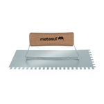 Desempenadeira de aço dentada, banhada em verniz anti oxidação com cabo anatômico fabricado em madeira tratada. Ideal para aplicação de argamassas, massa corrida, texturas entre outros.
