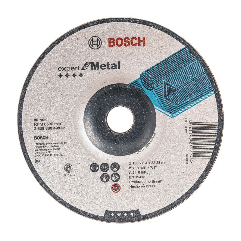 O disco de desbaste Bosch Expert for Metal proporciona grande rendimento em desbaste em metal, com cada disco tendo alta capacidade de remoção de material até o fim de sua vida útil. São produzidos com grãos abrasivos de óxido de alumínio de alta qualidade e telas de fibra de vidro feitas com precisão e simetria que trazem alta estabilidade para os discos. São fabricados sob alto padrão de qualidade em conformidade com as normas internacionais (EN 12413) e possuem certificações de qualidade como ABNT (Brasil) e OSA (Europa) trazendo máxima segurança durante sua aplicação. São indicados para desbaste de metais ferrosos e não ferrosos e ferro fundido e utilização em esmerilhadeiras manuais.
