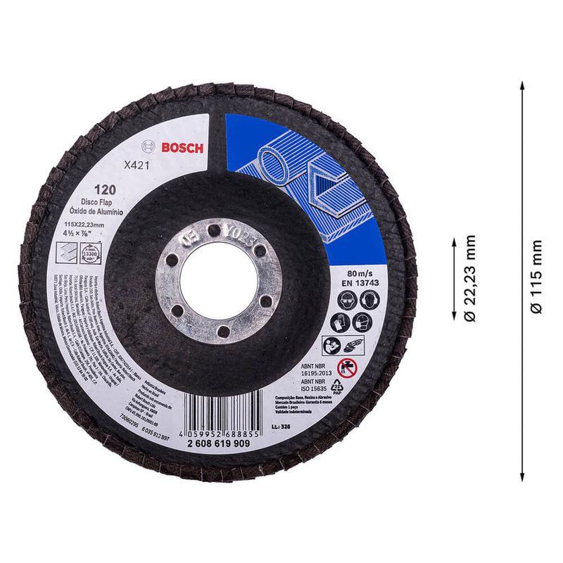 O Disco Flap Bosch X421 Óxido de Aluminio possui um dos melhores custo-benefício do mercado. O grão abrasivo de óxido de alumínio garante alta remoção de material em todos os tipos de metal, além da sua alta durabilidade através do tecido X que traz mais robustez e firmeza durante as aplicações em superfícies difíceis. É ideal para aplicações de remoção de solda, eliminação de material e descoloração, tratamento de superficies e lixado de estruturas. O Disco Flap Bosch X421 Óxido de Aluminio é universalmente compatível com esmerilhadeiras. Pacote vem com 10 unidades. Garantia 6 meses Bosch.
