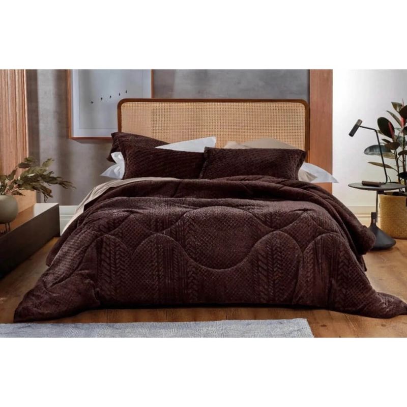 Na sofisticada cor Geo Comfy (Marrom), este edredom adiciona um toque de modernidade e serenidade ao ambiente, harmonizando facilmente com diversas decorações. Seu tecido superior é 100% poliéster, e o enchimento também é 100% poliéster, garantindo o volume ideal e leveza.
