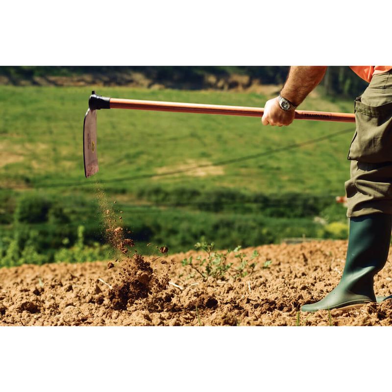 - O enxadão é temperado em todo o corpo da peça, proporcionando maior resistência e menor desgaste durante o uso. Fabricado em aço carbono especial de alta qualidade. Recebe pintura eletrostática a pó, que tem uma melhor apresentação visual e maior proteção contra oxidação. A tinta utilizada na pintura é isenta de metais pesados na sua composição, o que minimiza o impacto ambiental. A lâmina possui tamanho 2.0 e sua afiação é feita em máquinas automatizadas, proporcionando excelente durabilidade do fio.Possui olho de 38 mm de diâmetr O cabo de 130 cm desta ferramenta, além de possuir ótima resistência, é produzido com madeira de origem renovável. Cabo com acabamento envernizado, para um melhor acabamento e apresentação do produto. A camada protetora em verniz incolor realça sua tonalidade, concedendo brilho e um toque mais liso ao produto. O sistema de encabamento com bucha plástica proporciona excelente fixação do enxadão, evitando que os cabos se soltem durante o uso. A bucha absorve a contração da madeira, mantendo o cabo sempre firme, e auxilia na absorção do impacto durante o uso. Lâmina com ângulo reto em relação ao cabo: facilita escavar e revolver o solo de forma profunda, consequentemente, havendo maior revolvimento do material. A colheita de raízes e a abertura de covas para plantio pode ser facilitada utilizando este produto.