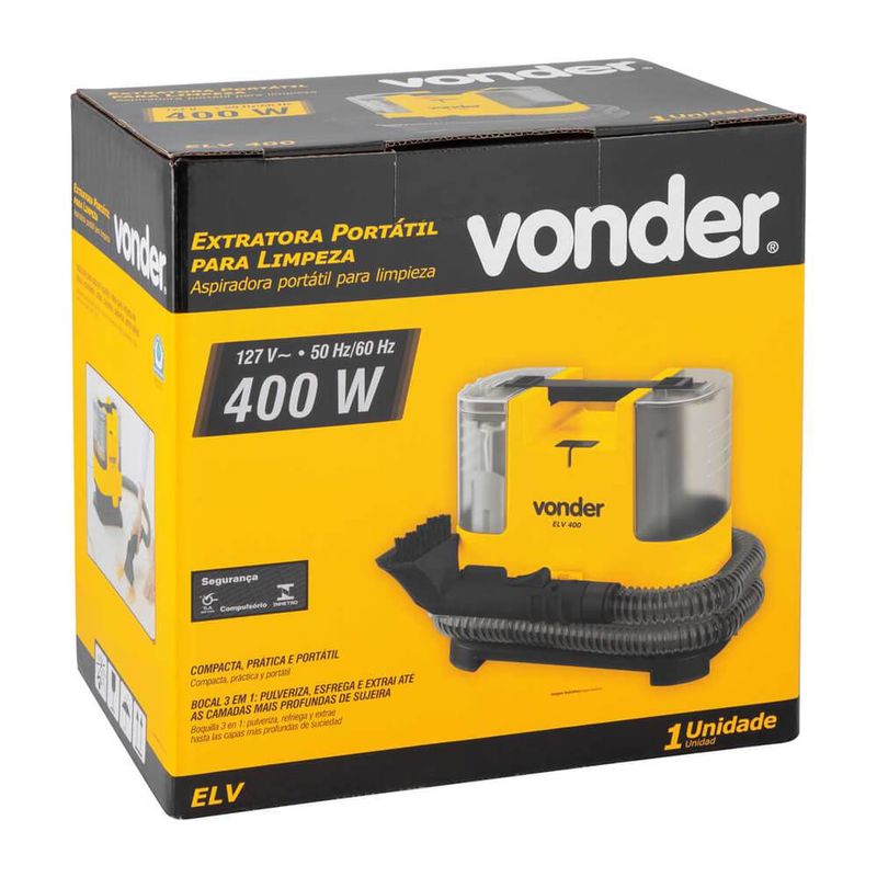 Extratora compacta, prática e portátil, possibilitando o fácil transporte nos trabalhos realizados. Possui reservatório para água limpa/produto de limpeza com capacidade total de 1,3 L e também para água suja com capacidade total de 500 ml, acompanha ainda bocal 3 em 1: pulveriza, esfrega e extrai até as camadas mais profundas de sujeira. Além de motor com dupla isolação, garantindo maior segurança ao operador.