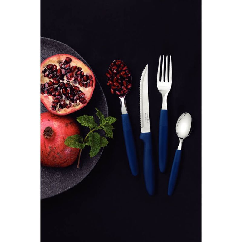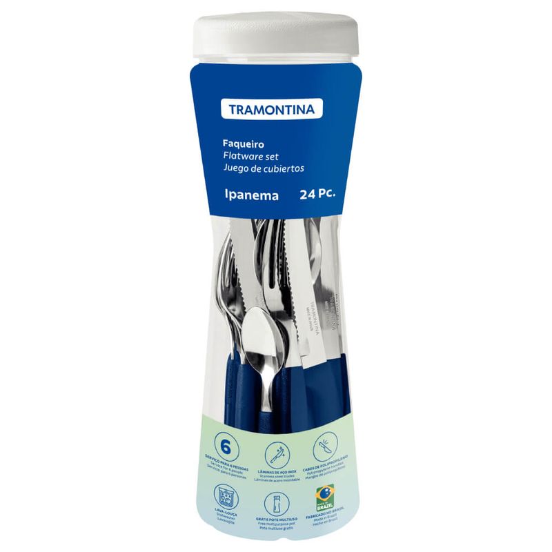 Para quem gosta de uma mesa linda e colorida, o Faqueiro Tramontina Ipanema com Lâminas em Aço Inox e Cabos de Polipropileno Azul com Pote Plástico 24 Peças é a escolha perfeita! Os talheres são todos produzidos com lâminas em aço inox e cabos de polipropileno, ambas características que garantem alta resistência e durabilidade, além de proporcionar uma mesa muito mais bonita, devido a cor azul. Ele é muito prático, fácil de limpar e acompanha um pote plástico ideal para armazenar suas peças ou alimentos em sua cozinha. Suas refeições serão repletas de alegria com esse faqueiro cheio de cor e estilo!