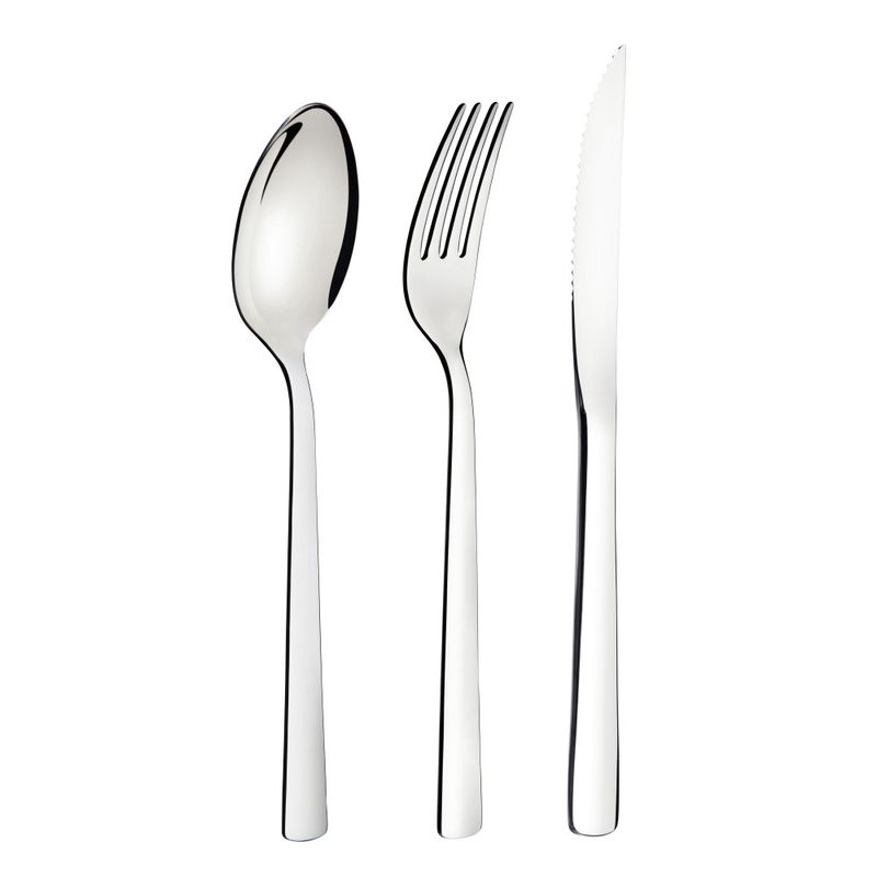 Facas totalmente temperadas, que garantem maior durabilidade no fio de corte e maior resistência à corrosão, e por suas características de temperabilidade, não riscam as porcelanas.