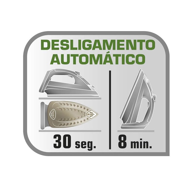 Pensando na sua segurança e economia, o Smartgliss FSC1 possui desligamento automático inteligente: após 30 segundos na horizontal ou 8 minutos na vertical, ele desliga sozinho, evitando acidentes e economizando energia. A função Eco reforça esse compromisso, enquanto o Sistema Corta-Pingos protege suas roupas de manchas indesejadas.