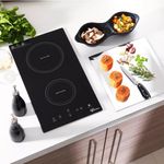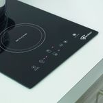 Com controle touch screen (sensível ao toque), mesa vitrocerâmica, dois queimadores, trava de segurança e 9 níveis de potência. Possui ainda sistema indicador de superfície quente e sensor de panela.