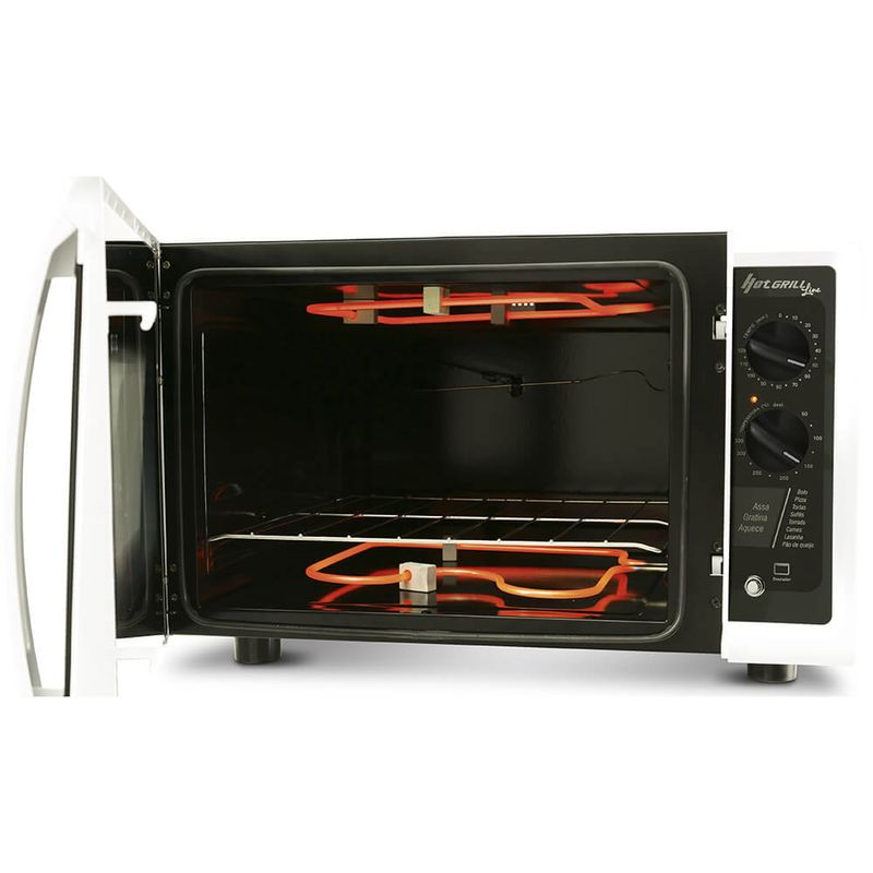 O Forno Hot Grill Line, possui visual contemporâneo, formas ?limpas? e linhas mais retas, em harmonia com as principais tendências estéticas e de design. Com frontal em termoplástico, conta com dourador, luz piloto, timer para programação até 120 minutos. Para maior segurança, a porta é com vidro duplo serigrafado e aquece menos. O controle de temperatura vai de 50ºC a 320ºC, corpo interno em easy clean que proporciona uma fácil limpeza, isolamento térmico total em alumínio e ainda os pés são antiderrapantes.