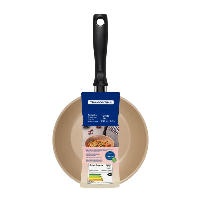 A frigideira Tramontina Turim em alumínio com revestimento interno e externo em antiaderente Starflon Max chumbo 16 centímetros de diâmetro 0,4 litros é uma peça muito prática para você preparar suas refeições diárias, seja um omelete ou uma tapioca. Produzida em alumínio com espessura de 1,2 milímetros e revestimento interno e externo de antiaderente Starflon Max, características que juntas, proporcionam o cozimento rápido e uniforme dos alimentos, evitam que eles grudem em sua superfície, a tornam fácil de limpar, mais durável e não prejudicial à saúde. O cabo é em baquelite antitérmico e oferece maior segurança durante o manuseio, pois não aquece. Além de todas essas características, ela é muito prática e pode ir à máquina de lavar louças, facilitando seu dia a dia. Escolha Tramontina e tenha o melhor para seu dia a dia!