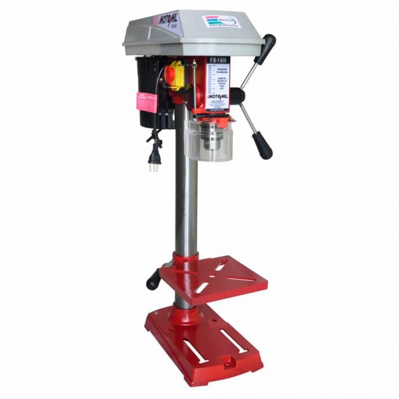 Furadeira de bancada Motomil fabricação nacional com desenho industrial patenteado, com interruptor magnético, mesa giratória inclinável e cabo com plugue conforme norma do Inmetro. Possui sistema de mancais com rolamentos blindados, cabeçote em ferro fundido, alavanca de avanço com 2 braços, fixação do motor com esticador permitindo rápida troca de correia, coluna em aço tubular, protetor do mandril e suporte da chave do mandril. Equipamento de fácil manuseio, conforto e segurança. Ideal para o uso em marcenarias, serralherias, carpintarias e oficinas em geral