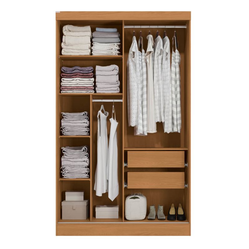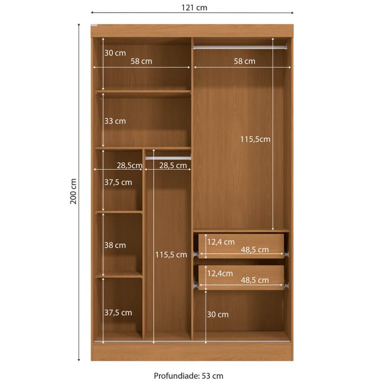 Com dimensões de: 200 x 120,5 x 53 cm, este guarda-roupa oferece um espaço interno bem distribuído para suas roupas e acessórios. As duas portas de correr otimizam o uso do espaço, ideal para ambientes compactos, enquanto o deslizamento suave proporciona conforto e fácil acesso. As duas gavetas internas garantem a organização de itens menores.