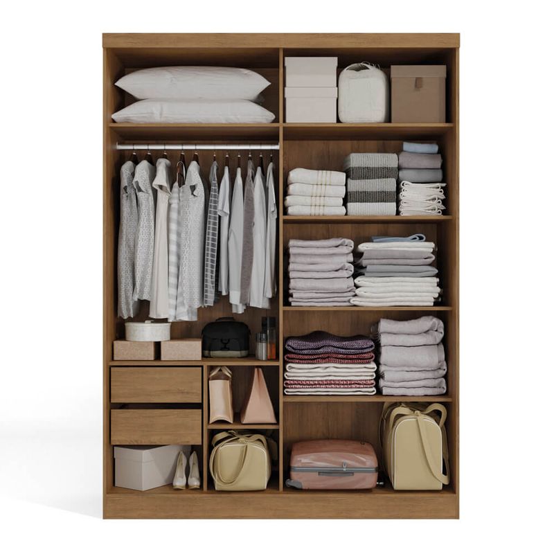 Internamente, o Guarda-Roupa J563 é inteligentemente dividido para atender todas as suas necessidades de organização: conta com duas gavetas internas equipadas com corrediças telescópicas, que garantem abertura suave e total, perfeitas para itens menores. Além disso, dispõe de cinco prateleiras espaçosas e cabideiros metálicos resistentes, ideais para pendurar roupas e organizar acessórios.