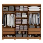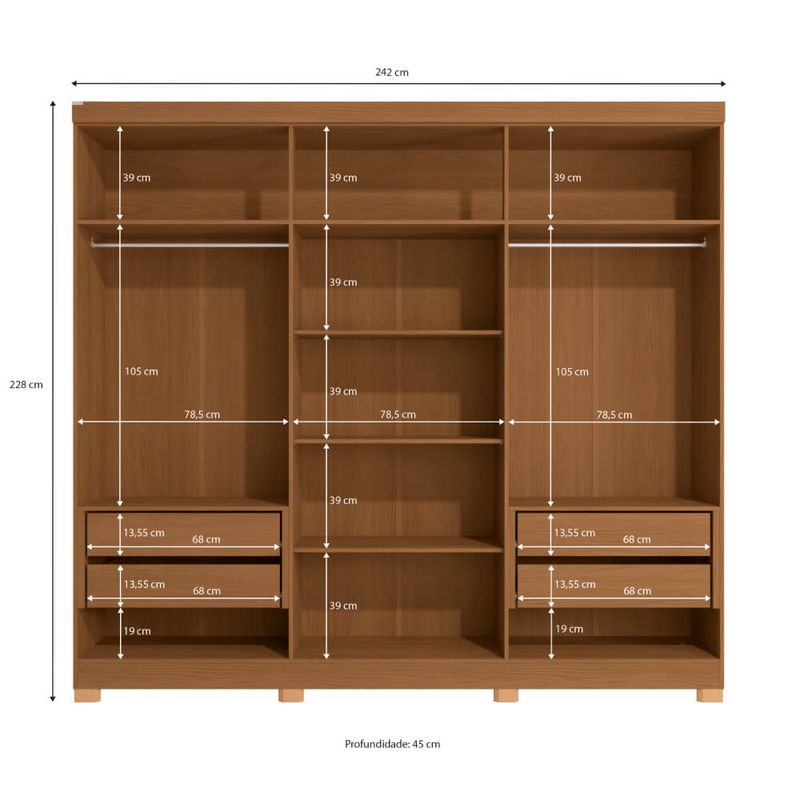 Com Dimensões de: 223 x 242 x 47 cm, este guarda-roupa otimiza seu espaço com maestria, proporcionando uma organização sem precedentes para suas roupas e acessórios. As seis portas de bater garantem acesso total ao interior, com a facilidade do manuseio tradicional. Os cabideiros Metálicos e as corrediças Metálicas (para as 04 Gavetas) asseguram durabilidade e um deslize suave, contribuindo para o conforto no uso.