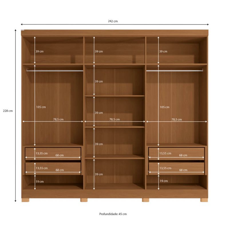 Com Dimensões de: 223 x 242 x 47 cm, este guarda-roupa otimiza seu espaço com maestria, proporcionando uma organização sem precedentes para suas roupas e acessórios. As seis portas de bater garantem acesso total ao interior, com a facilidade do manuseio tradicional. Os cabideiros Metálicos e as corrediças Metálicas (para as 04 Gavetas) asseguram durabilidade e um deslize suave, contribuindo para o conforto no uso.