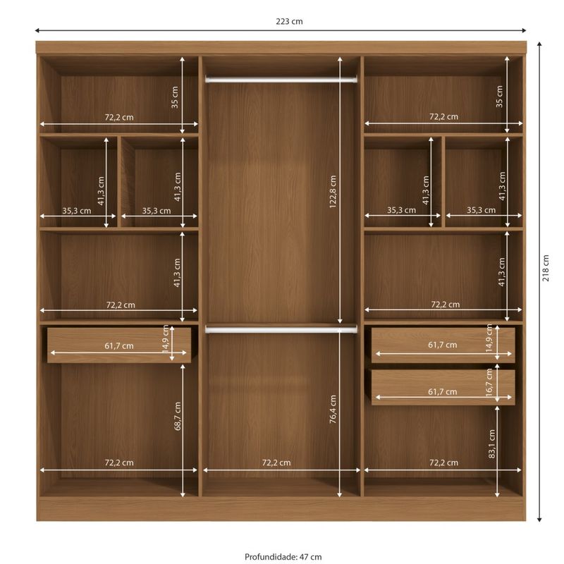 Com dimensões de: 218 x 223 x 47 cm, este guarda-roupa otimiza seu espaço com maestria, proporcionando uma organização exemplar para suas roupas e acessórios. As seis portas de bater garantem acesso total ao interior, com a facilidade do manuseio tradicional. Os cabideiros Metálicos e as corrediças Telescópica, asseguram um deslize suave, contribuindo para o conforto no uso.