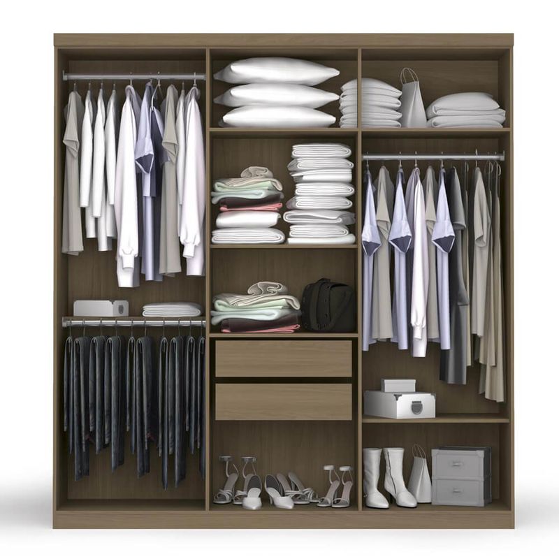 No interior, você encontrará dois cabideiros de madeira, ideais para organizar suas roupas longas sem amassar. As duas gavetas possuem corrediças metálicas, garantindo abertura suave e total, perfeitas para itens menores. Além disso, as diversas prateleiras internas suportam até 7 kg cada, permitindo que você organize suas roupas, acessórios e objetos pessoais com total segurança.