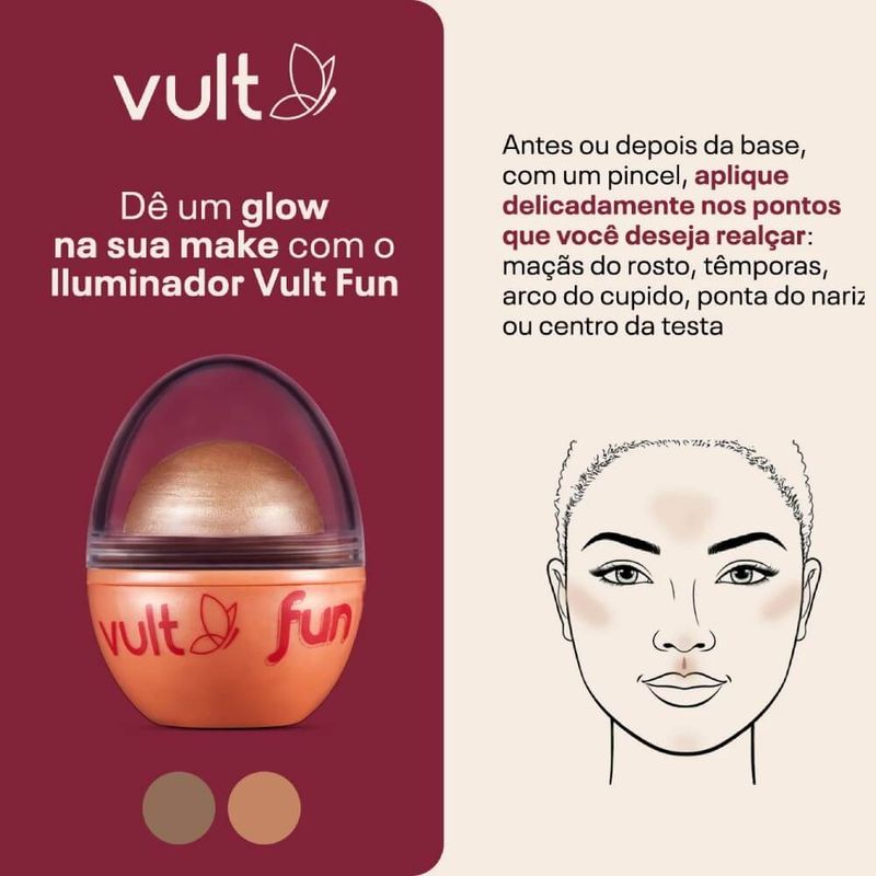 O Iluminador 3 em 1 Vult Fun Dourado Radiante destaca e ilumina seu rosto dando efeito de pele naturalmente iluminada.