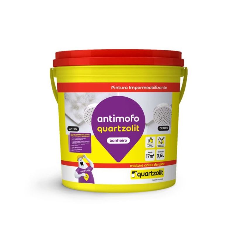 O antimofo quartzolit é uma pintura impermeabilizante de excelente acabamento fosco para teto de banheiros, cozinhas, saunas e outros ambientes sujeitos à umidade e ao vapor d'água. O produto evita o aparecimento de manchas de bolor e descascamento de tintas provocados pelo vapor.