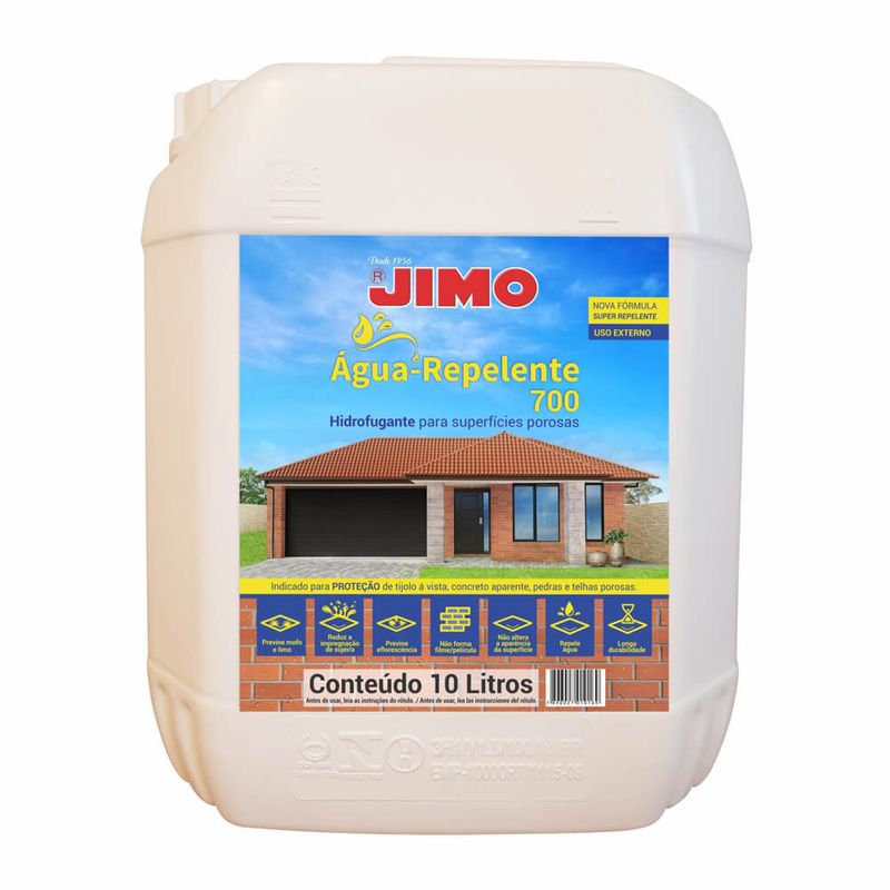 JIMO ÁGUA-REPELENTE 700 é um hidrofugante à base de água, pronto para o uso, especialmente desenvolvido para proteger superfícies porosas. Possui micropartículas que penetram, reagem e aderem fortemente ao substrato, fazendo uma barreira química que repele e reduz a absorção de água. É ideal para muros, fachadas e telhados, não sendo recomendado para superfícies horizontais.