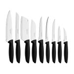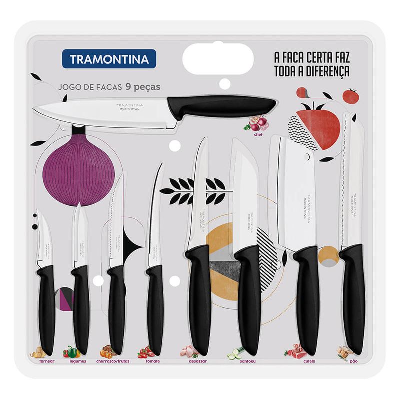 Com o Jogo de Facas Tramontina Plenus com Lâminas em Aço Inox e Cabos de Polipropileno Preto 9 Peças, você terá a solução completa de facas para utilizar nos mais diversos tipos de cortes e ocasiões gastronômicas. As peças combinam com qualquer cozinha e a deixam mais bonita e clássica, pois seus cabos são na elegante cor preta. As lâminas produzidas em aço inox por terem sido submetidas a tratamento térmico, oferecem maior durabilidade e resistência. As facas são fáceis de limpar e podem ser lavadas na máquina de lavar louças. Com peças únicas e de muita importância na cozinha, o jogo de facas é a escolha perfeita para você. Facas de qualidade e beleza você encontra com a Tramontina!