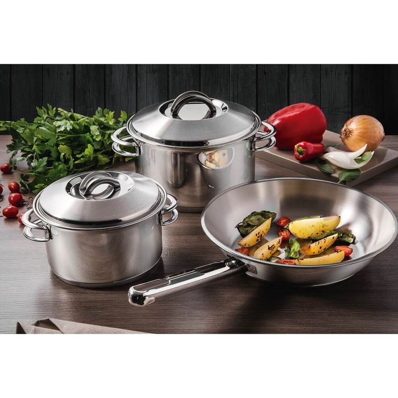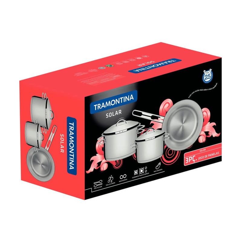 O prazer de fazer bonito com produtos que transformam a cozinha. O Jogo de Panelas Tramontina Solar em Aço Inox com Fundo Triplo 3 Peças, com duas caçarolas e uma frigideira, possui desenho limpo e sem cantos totalmente feitas em aço inox. O fundo triplo (aço inox + alumínio + aço inox) distribui o calor uniformemente, proporcionando um cozimento mais rápido e uniforme, economizando energia e deixando os alimentos aquecidos por mais tempo. O design diferenciado e moderno tem acabamento em alto brilho. Tampas com saída de vapor e encaixe perfeito. A linha Solar é símbolo de durabilidade e praticidade.