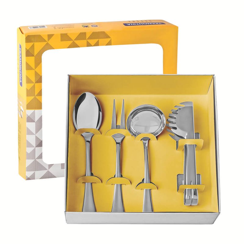 Sua cozinha vai ganhar mais estilo com o Jogo de Utensílios Tramontina em Aço Inox 4 Peças. Produzidos com o sofisticado aço inox, material altamente durável que garante resistência às 4 peças do conjunto.
