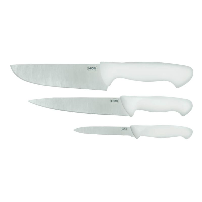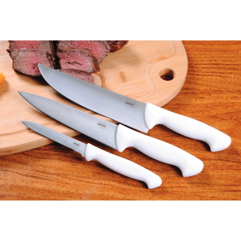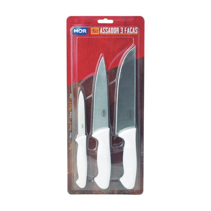 O Conjunto do Assador da Mor vai muito além do churrasco. Com 3 tipos diferentes de faca: para lardear, para desossar e carne, este conjunto é a praticidade que faltava na sua cozinha. Produzidos com lâmina em aço inoxidável, que confere maior durabilidade e resistência, e cabos brancos em polipropileno, práticos de higienizar e firmes ao manusear. É um produto que não pode faltar na casa dos apreciadores de uma boa gastronomia.