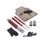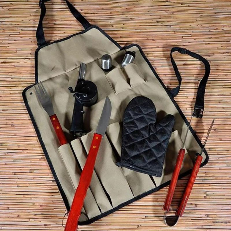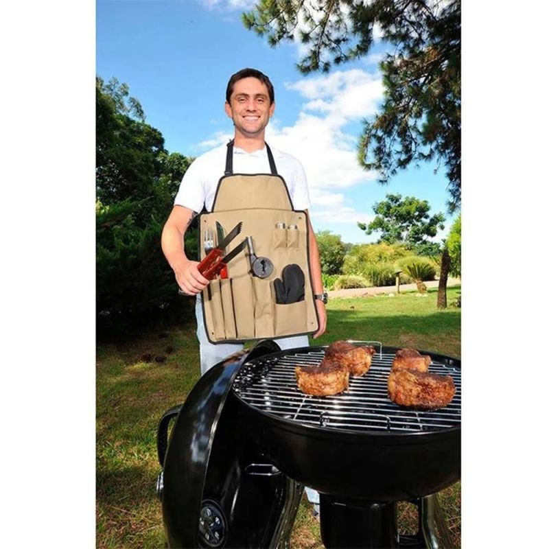 Conta com faca, garfo, pegador, luva, avental, saleiro, frasco de pimenta e assoprador, perfeito para servir e assar um bom churrasco com praticidade e eficiência com tudo o que você precisa ao alcance das suas mãos.