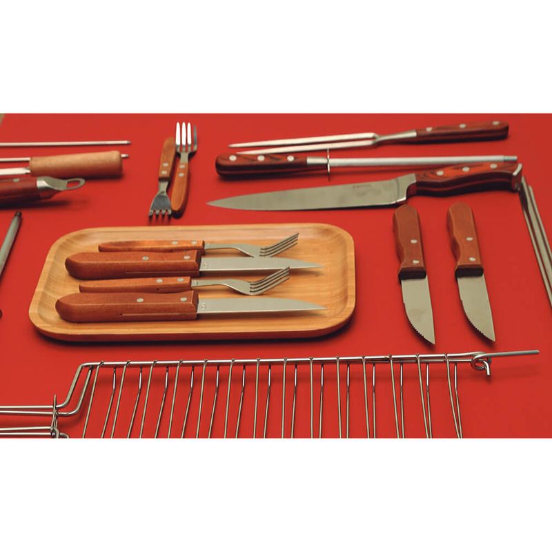Composto por seis facas e seis garfos, o Conjunto para Churrasco Garfo e Faca 12 Peças Mor é excelente para fazer parte do seu almoço de domingo reunindo a família e os amigos. Unindo estilo e design, são produzidos em aço inox com cabo em madeira. Extremamente duráveis, podem ir à lava-louça e permanecem bonitos por muito mais tempo. Diferenciada, a faca de serra possui lâmina mais larga e cabo mais robusto que as facas de modelo tradicional, garantindo o manuseio firme e corte preciso até mesmo nos maiores pedaços de carne.