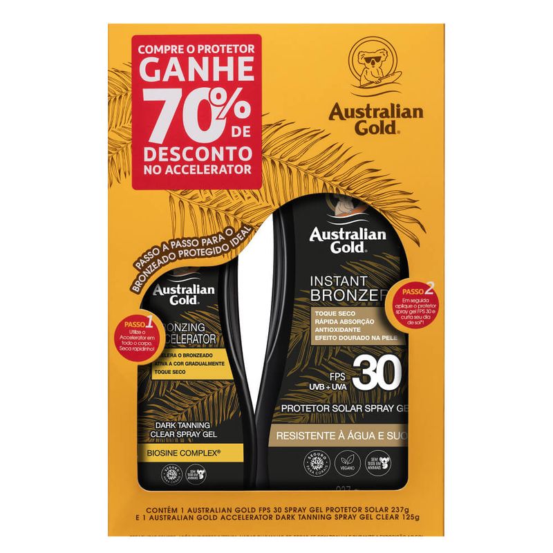 Kit com protetor solar spray e bronzeador para todos os tipos de pele. Australian Gold Instant Bronzer protege do sol com brilho dourado.