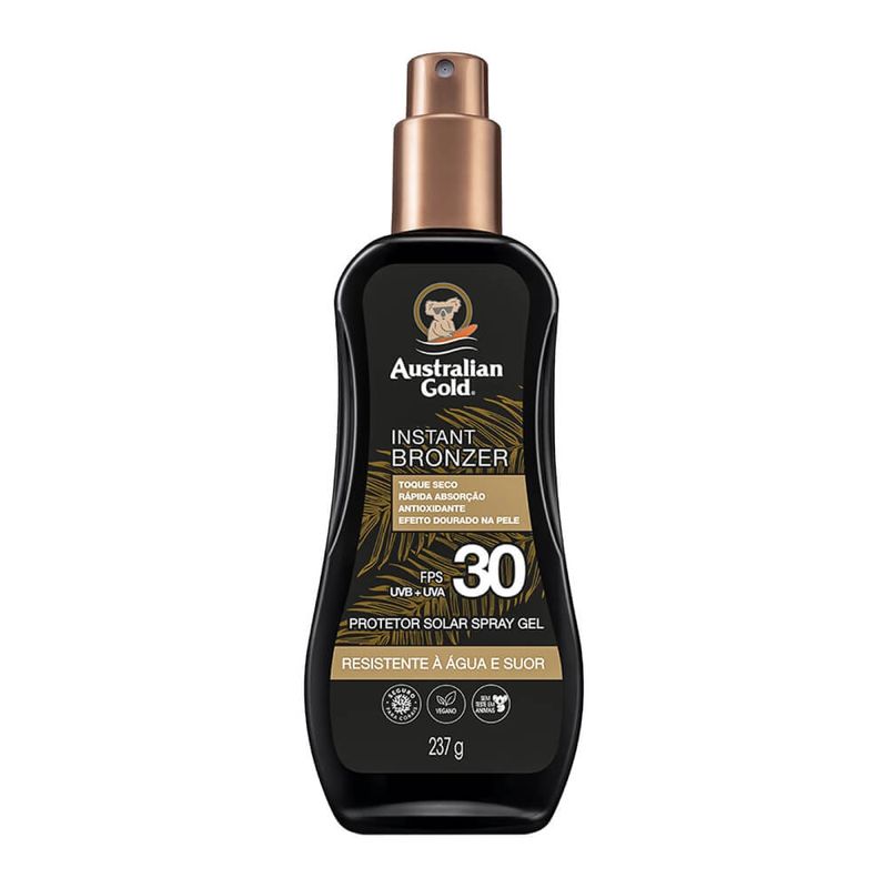 Protetor solar corporal em spray. Australian Gold Instant Bronzer FPS 30 protege a pele dos raios UVA e UVB e confere um bronzeado luminoso.