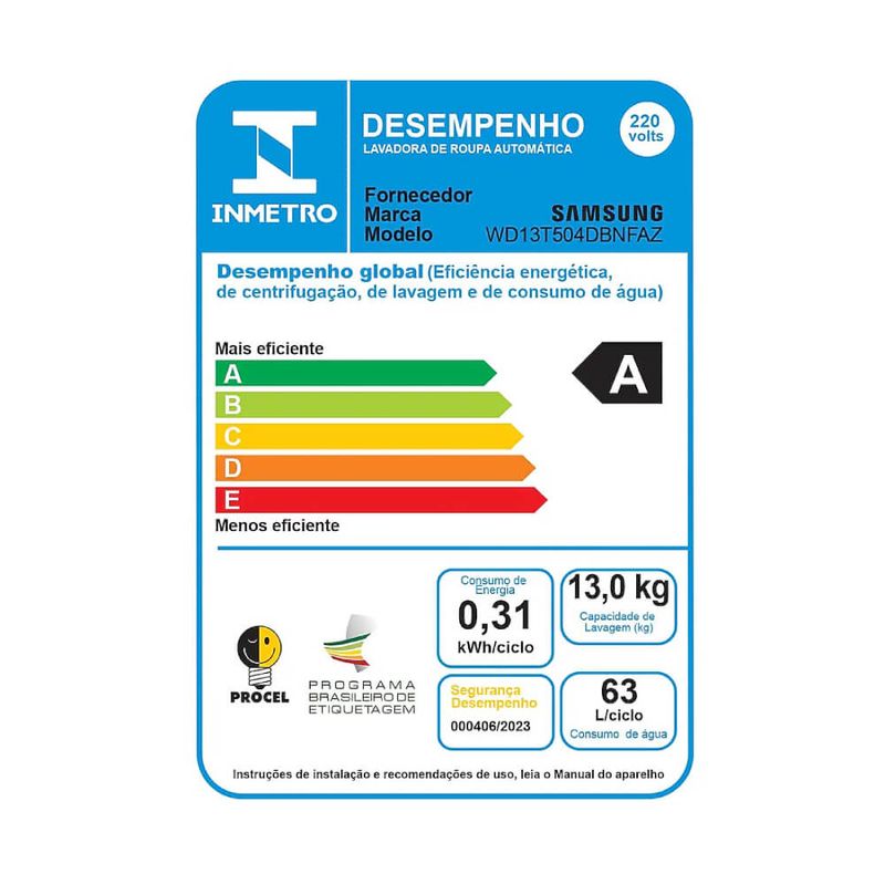 Capacidade de lavagem: 13Kg