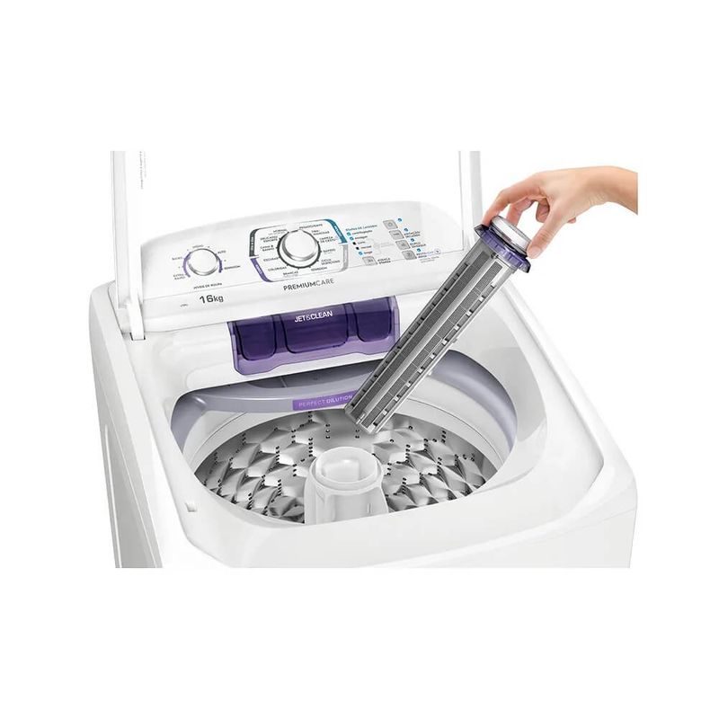 Os produtos diluídos são adicionados a água pelas laterais do cesto e não depositados sobre as roupas, evitando manchas.