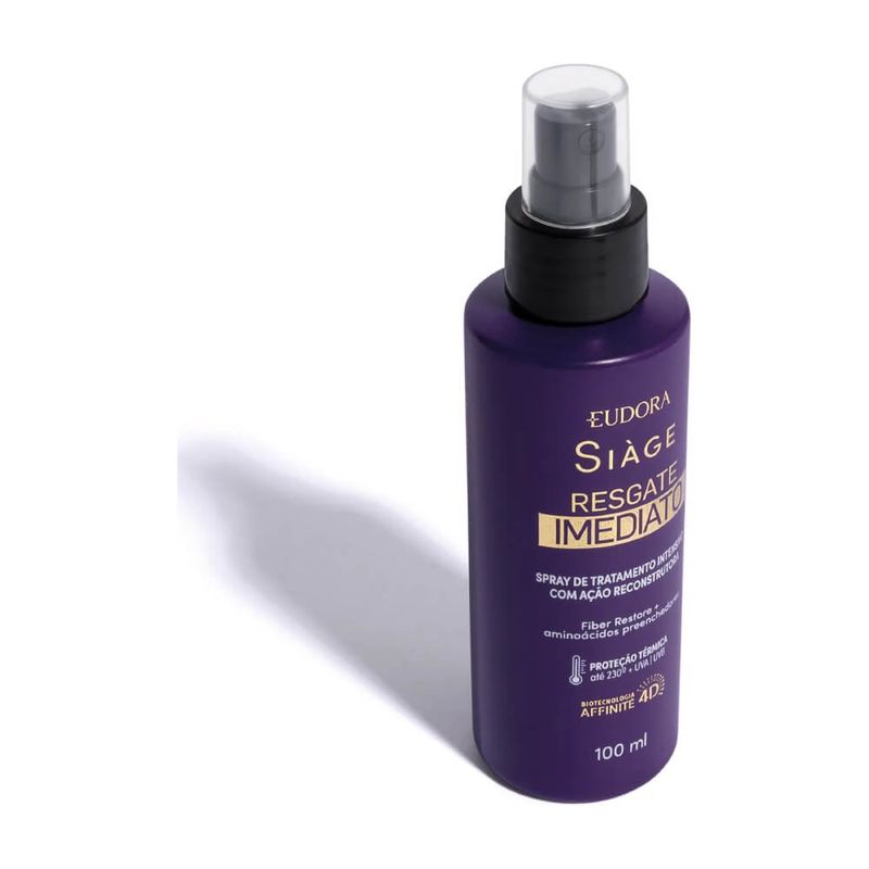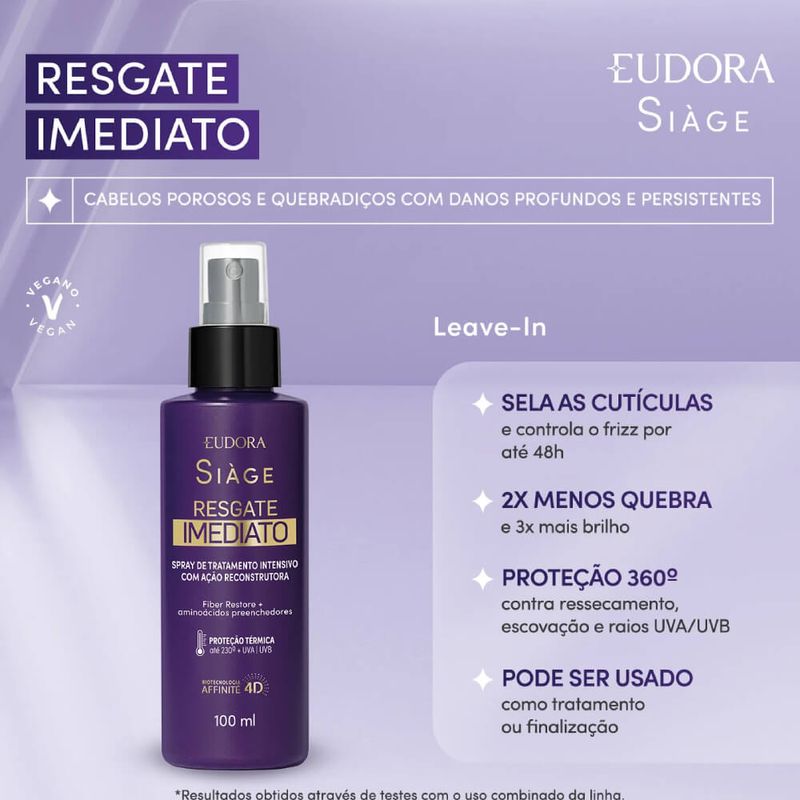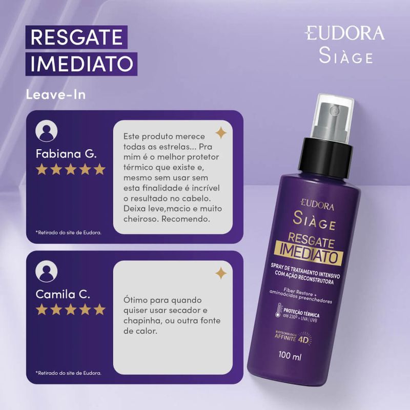 Ideal para o momento de tratamento do seu hair care ou para a finalização dos seus fios, o Leave-In Siàge Resgate Imediato vai te auxiliar a resgatar seu cabelo e descobrir novos momentos de autocuidado! Agora com nova embalagem, mas mantendo a mesma fórmula, o Leave-In Siàge Resgate Imediato proporciona tratamento multibenefícios que restaura os cabelos extremamente danificados desde o 1º uso. Podendo ser usado como item de tratamento ou finalização , o Spray Resgate Imediato possui ação reconstrutora duradoura que repõe proteínas e aminoácidos garantindo: -Proteção 360º: ressecamento, escovação, raios UVA/UVB e calor; -2x menos quebra; -Ultra Maciez; -3x mais brilho; -Cutículas seladas; -Controle do frizz por até 48h. A linha é dedicada para todos os tipos de cabelos, com a exclusiva Biotecnologia Affinité 4D e ativos pensados para reconstruir seus fios, Resgate Imediato Eudora traz benefícios comprovados¹: -Resgata imediatamente fios com danos difíceis, persistentes e que parecem não ter solução²; -Escudo antidanos: envelopamento dos fios proporcionando um escudo protetor que evita danos futuros; -Efeito preenchedor antiqueda: preenche as partes lesionadas da haste reduzindo a porosidade. Toda a linha possui fórmulas enriquecidas com FIBER Restore® que age desde o córtex capilar adentrando profundamente e criando pontes que suportam a estrutura da queratina danifica e, assim, fortalecem o fio , e Aminoácidos Preenchedores que atuam na reposição dos componentes essenciais da fibra capilar danificada. Siàge Resgate Imediato traz a etapa de reconstrução do cronograma capilar, resgatando imediatamente fios com danos persistentes. SOBRE SIÀGE Eudora Siàge uniu a força da natureza ao poder da ciência e criou a exclusiva Biotecnologia Affinité 4D . Com inteligência detectora de danos, trata os fios até a camada mais profunda, mesmo após o enxágue. Siàge, Tecnologia para o seu melhor cabelo, todos os dias! Nenhum produto Eudora é testado em animais, ou seja, este item possui selo Cruelty Free. ¹Resultados obtidos através do uso combinado da linha. ²Fios com danos profundos causados por química ou fontes de calor.
